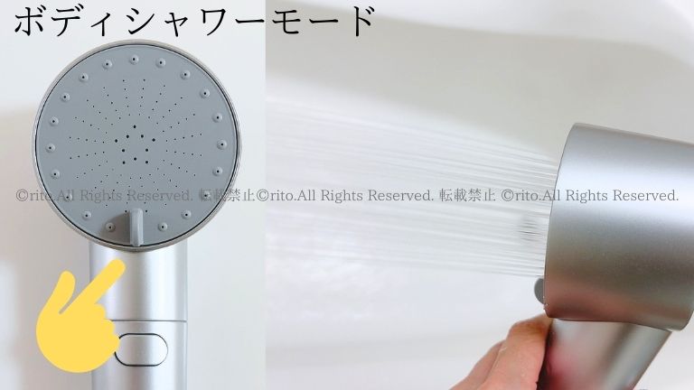 サロニアのボディシャワーモードは、水圧が優しく(弱め)、肌あたりが非常にマイルドなんです。